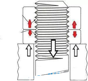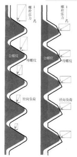 普通螺紋———60°角V形螺紋在其第一螺紋嚙合面和第二螺紋嚙合面承載了70%~80%的負荷,而以后幾個嚙合面承受的負荷很少。這樣一來普通螺紋緊固件在工作振動負荷條件下,就很容易克服螺紋接觸面上的鎖緊力而產(chǎn)生轉(zhuǎn)動,進而松脫,這就是普通螺紋緊固件松脫的原因所在。