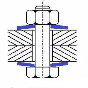 這種墊圈的一面是大斜齒面,在墊圈的另一面有放射狀鋸齒。NORD-LOCK墊圈是大齒面相對,成對安裝的。當擰緊螺栓或螺母時,放射狀鋸齒緊緊咬住接觸面,使NORD-LOCK墊圈分別與螺母和連接件接觸面相對固定,只允許大斜齒面間的相對移動。螺栓或螺母的任何松動趨勢都被大鋸齒的這種楔入效果所阻止。兩片NORD-LOCK墊圈之間的抬升距離大于因螺紋滑動引起的螺栓或螺母抬升的距離。